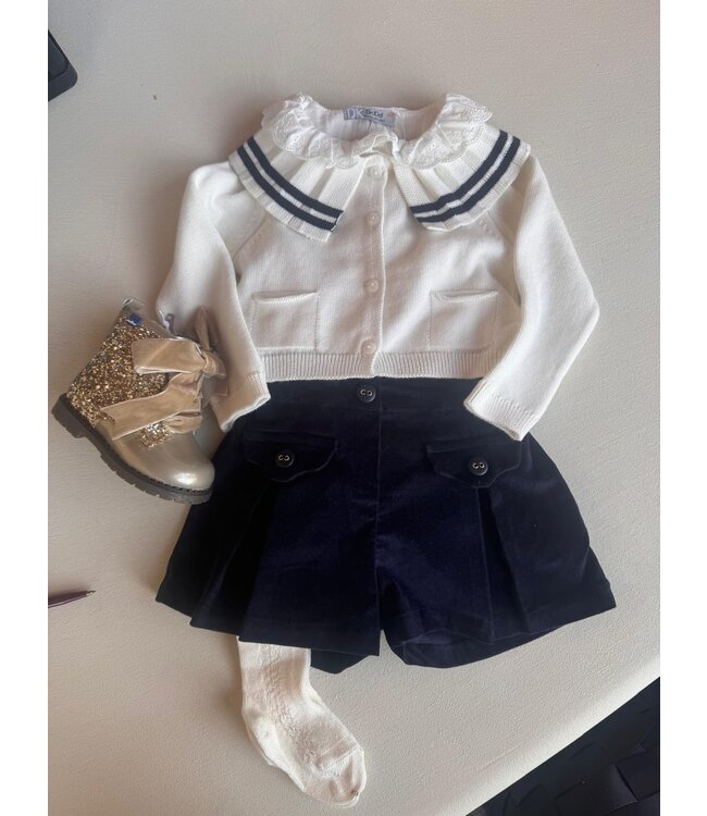 Donkerblauw ribfluweel shortje, verstelbaar in de taille. mooi gecombineerd met ecru gilet met blauw en ecru bloesje van Dr Kid. Machinwasbaar