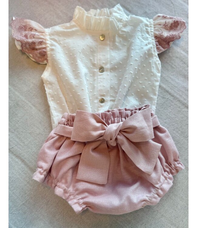 Setje bestaande uit een shortje luxueus afgewerkt met grote strik, in roze met zacht zilveren metaaldraad voor zachte glinstering. Rekker in de taille. Met bijhorend blousje in ecru met licht opstaand kraagje en met kanten kapmouwtje.